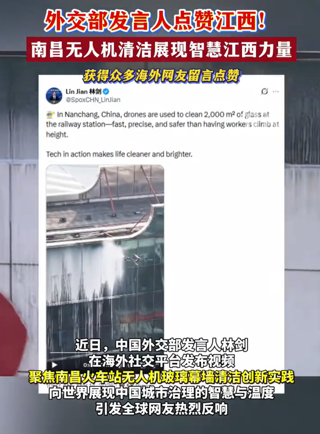 据北京日报:近日,中国外交部发言人林剑在海外社交平台发布视频,向世界推介南昌站无人机高空清洁站房玻璃的创新应用,林剑说:“在中国南昌,无人机被用于清理火车站2000平方米的玻璃——速度快、精度高,而且比让工人攀高作业更安全。科技在行动中让生活变得更洁净、更明亮。”