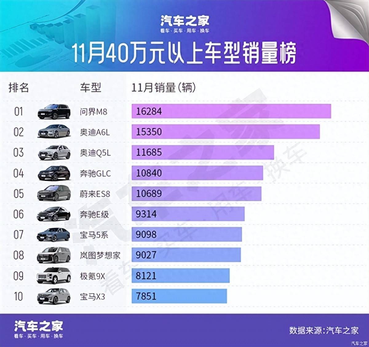 这份牵动无数消费者神经的榜单,藏着太多出人意料的变化。11月40万元以上车型总榜中,10款热门车型累计销量突破10万辆,但排名顺序让不少老车迷跌破眼镜:问界M8以16284辆的成绩强势登顶,成为该价位段销量冠军,而常年霸榜的奥迪A6L则以15350辆屈居第二,这也是总榜中排名最高的合资车型。